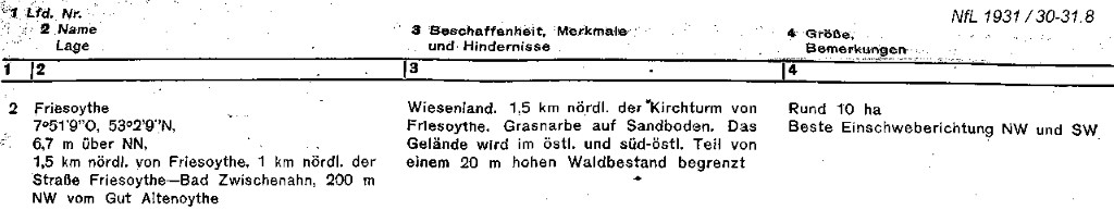 Eine 18 Hektar große Fläche nordwestlich des Hofes Wreesmann war 1926 als Grünland erworben worden. Der heutige Waldbestand nordwestlich des Hofes war damals noch nicht vorhanden, ebensowenig wie der Graben, der heute quer zur Fläche verläuft. Die (beste) Einschwebemöglichkeit aus Nordwest und Südwest bedeutet, dass es sich um einen rechtwinkligen Landeplatz entlang der Vitusstraße, (zwischen Vitusstraße und der alten Junkenallee) und der Strasse In den Kämpen/Neuland gehandelt hat. Insgesamt also etwa das Gelände, auf dem sich heute die Apfel- und Aronia Plantage von Jan Wreesmann befindet. Da in Deuschland 1931 die Militärfliegerei noch nicht erlaubt war, muss es sich hier um einen Notlandeplatz für Sport- und Segelflugzeuge gehandelt haben. Bei der Angabe der Koordinaten allerdings hat sich offensichtlich ein Übertragungsfehler eingeschlichen. Die angegebenen Koordinaten würden direkt in die Stadt Friesoythe führen. Bei der Längengradangabe muss es 7°51‘4“ statt 7°51‘9“ heißen.